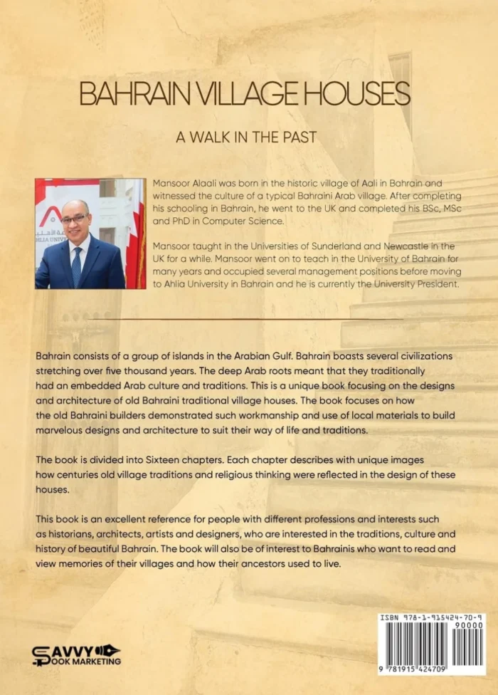 Bahrain consists of a group of islands in the Arabian Gulf. Bahrain boasts several civilizations stretching over five thousand years. The deep Arab roots meant that they traditionally had an embedded Arab culture and traditions. This is a unique book focusing on the designs and architecture of old Bahraini traditional village houses. The book focuses on how the old Bahraini builders demonstrated such workmanship and use of local materials to build marvelous designs and architecture to suit their way of life and traditions. The book is divided into Sixteen chapters. Each chapter describes with unique images how centuries old village traditions and religious thinking were reflected in the design of these houses. This book is an excellent reference for people with different professions and interests such as historians, architects, artists and designers, who are interested in the traditions, culture and history of beautiful Bahrain. The book will also be of interest to Bahrainis who want to read and view memories of their villages and how their ancestors used to live.